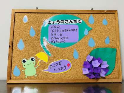 この頃、給食室では調理員さん手作りの献立ボードを掲示しています。