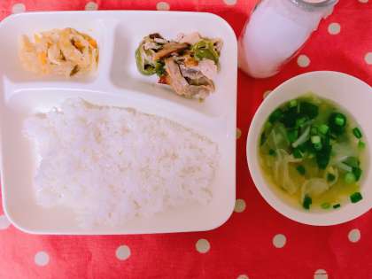 今日のこんだて【米飯、豚肉の梅風味焼き、すまし汁、切り干しだいこんのいため煮、牛乳】