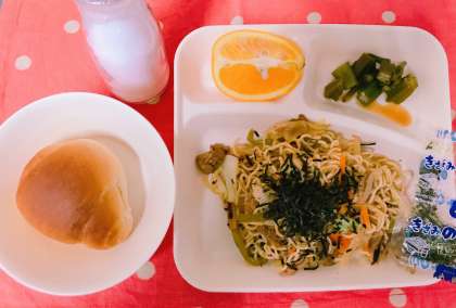 今日のこんだて【黒糖パン、焼きそば、オクラの中華あえ、オレンジ】