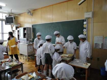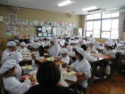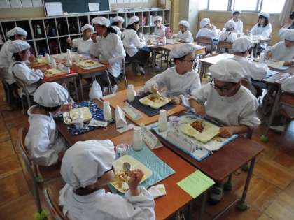 配膳も献立を読むのも、6年生に手伝ってもらいながら準備をしていました。