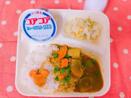 「チキンカレーライス」は、鶏肉を主材に、じゃがいも、たまねぎ、にんじんを使用しています。トマト缶の旨みにりんごピューレの甘みを加えたカレーライスです。本日は、キャラクターの形のラッキーにんじんが入っています。