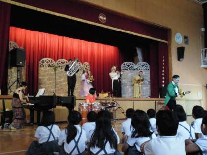 音楽劇「シンデレラ」を披露していただきました。さまざまな楽器をつかっておもしろ楽しく演じてくださるのを観て、「わぁー」「はははぁー」と歓声があがっていました。
