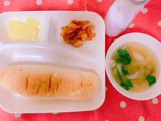 今日のこんだて【おさつパン、えびのチリソース、中華スープ、りんご(缶)】