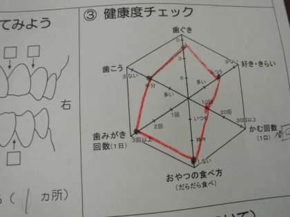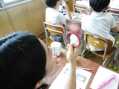 歯周病についてのお話をしてもらったり、歯垢染色液を使って磨き残しを調べ、歯垢がきちんと取れるように歯ブラシでしっかりと磨いたりしました。
