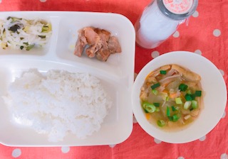 今日のこんだて【米飯、鶏肉のしょうゆマヨネーズ焼き、五目汁、切り干しだいこんのゆずの香あえ、牛乳】