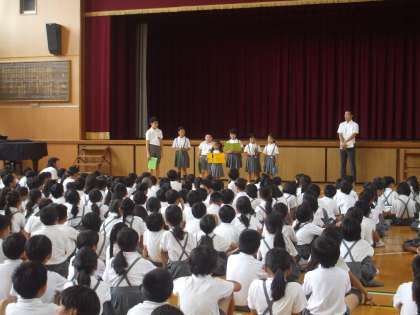 終業式では、各学年の代表が1学期を振り返って頑張ったことや思い出に残っていることなどを作文で読みました。