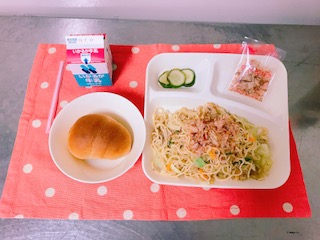 今日のこんだて【黒糖パン、和風焼きそば、きゅうりのゆず風味、牛乳】