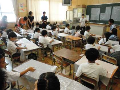 1年生は、ゴミ袋でカッパ作りと簡易トイレの体験をしました。