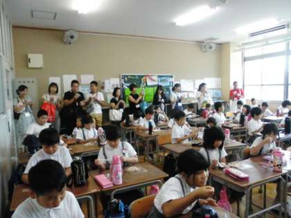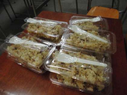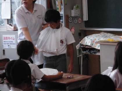 3年生は、アルファ化米の試食とレジ袋で三角巾を作る体験をしました。