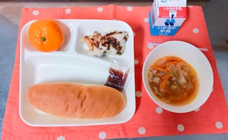 今日のこんだて【コッペパン、いちごジャム、豆乳マカロニグラタン[米粉]、トマトスープみかん(冷)、牛乳】