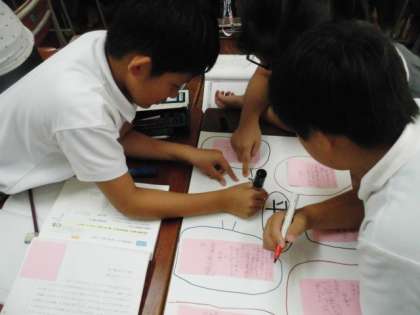 考えを交流する際には、一人1つ付箋に意見を書き、それをもとに仲間分けをしたり、話合いをしたりして、考えを深めていました。