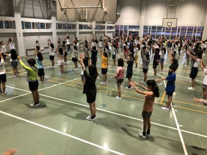 今日はあいにくの雨ですが、体育館でラジオ体操をして、体を起こします。