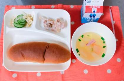 今日のこんだて【黒糖パン、鶏肉のからあげ、とうがんの中華スープ、切り干しだいこんの辛みづけ、牛乳】