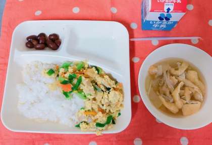 今日のこんだて【親子丼、とうがんのすまし汁、金時豆の煮もの、牛乳】