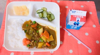 今日のこんだて【ビーフカレーライス[米粉]、きゅうりのピクルス、白桃(カット缶)、牛乳】