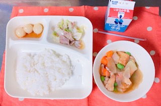 今日のこんだて【米飯、鶏肉とさといもの煮もの、豚肉とキャベツのいためもの、みたらしだんご、牛乳】