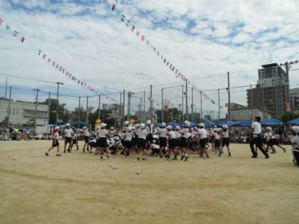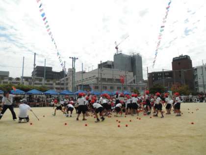 赤組・白組に分かれ、自分の身長よりも高いかごをめがけて玉を投げ入れて、玉の数の合計で勝敗を競います。