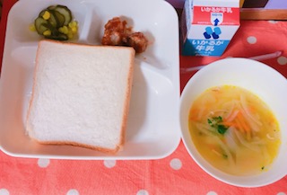 今日のこんだて【食パン、マーマレード、まぐろのオーロラ煮、スープ、きゅうりとコーンのゆずドレシング、牛乳】