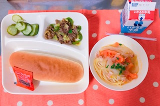 今日のこんだて【コッペパン、いちごジャム、牛肉のカレー風味焼き、トマトのスープスパゲッティ、きゅうりのサラダ】