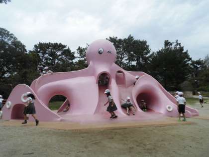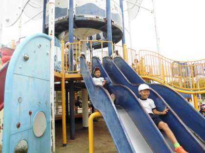 着いてすぐ遊具で思いっきり遊びました。いろいろなすべり台があり、お尻が痛くなるくらい何度もすべっている子もいました。