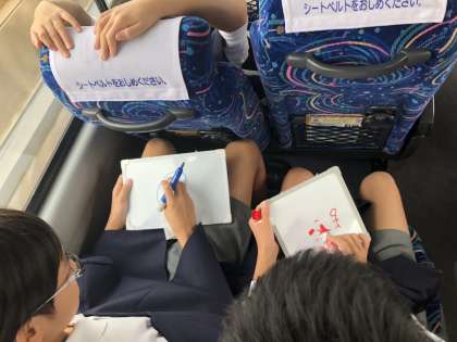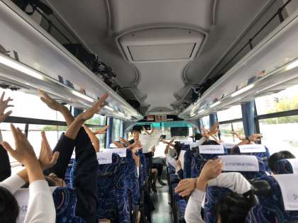 バスの中では、クイズや伝言ゲームなどのレクリエーションが行われています。