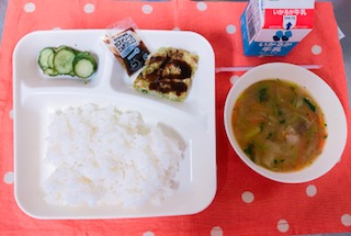 今日のこんだて【米飯、お好み焼き、豚汁、きゅうりの梅風味、牛乳】