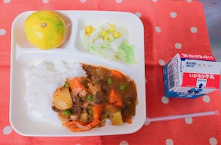 今日のこんだて【ハヤシライス[米粉]、キャベツとコーンのサラダ、みかん、牛乳】