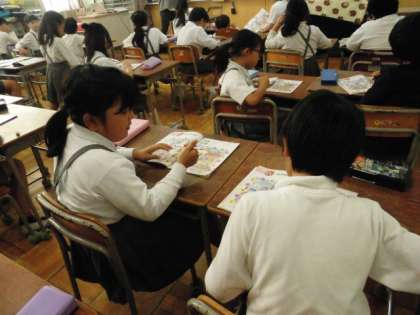 挿絵の中から、たくさんのアルファベットを見つけていました。毎週活動しているフォニックスが生かされ、英語に興味を持っている子どもがたくさんいます!