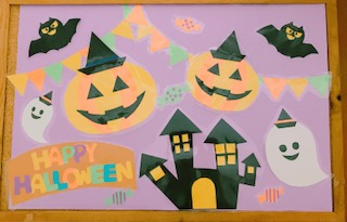 また、今日は外国の行事ハロウィンの日ということもあり、給食室の掲示もハロウィンをモチーフにしています。