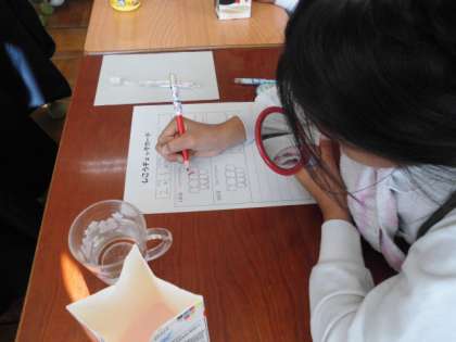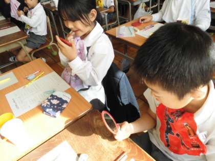 大人の歯が生え始めの子どもたちに、なぜ虫歯になるのかや、一番虫歯になりやすい「だい一大きゅう歯」について詳しく教えていただきました。みんな大きな口を開けて、自分のだい一大きゅう歯をみて、「ぼこぼこしてる」「めっちゃ奥にある」と食べかすが詰まりやすく、磨きにくさを感じているようでした。
