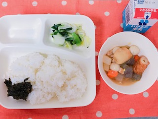 今日のこんだて【米飯、関東煮、こまつなとはくさいの甘酢あえ、のりのつくだ煮、牛乳】