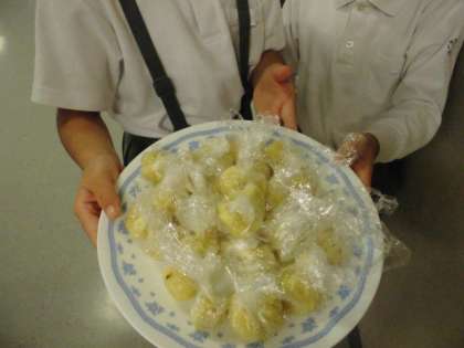 お芋を湯がき、柔らかくなるまで火が通ったら、つぶして砂糖を混ぜます。その後、ラップでくるんでかわいく形を整えました。
