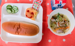 今日のこんだて【黒糖パン、ツナポテトオムレツスープ、きゅうりのバジル風味サラダ、牛乳】