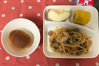 今日のこんだて【黒糖パン、チキントマトスパゲッティ、焼きとうもろこし、りんご、牛乳】