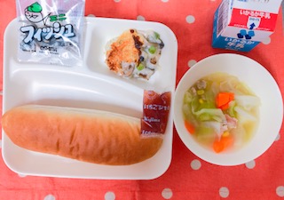 今日のこんだて【コッペパン、イチゴジャム、鶏肉とじゃがいものスープ煮、きのこのドリア、ミニフィッシュ、牛乳】