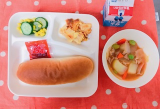 今日のこんだて【コッペパン、イチゴジャム、豚肉と野菜のケチャップ煮、きゅうりとコーンのサラダ、桃のクラフティ、牛乳】