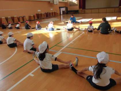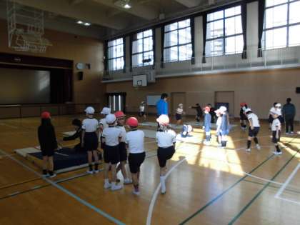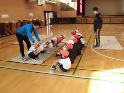 柔軟体操の後、前転や後転に取り組みました。先生の話をよく聞いて、ポイントを押さえて上手にできるように何度も繰り返し練習しました。