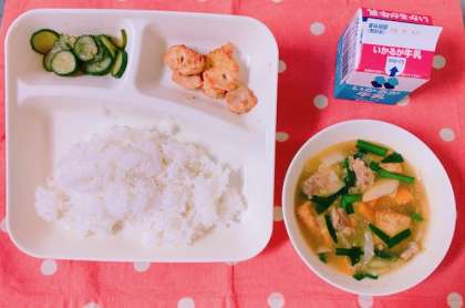 今日のこんだて【米飯、鶏肉のチリソース焼き、中華煮、きゅうりの中華あえ、牛乳】
