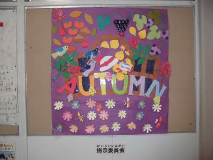 まだまだ暑いですが掲示作品には、「さんま・色づいた葉っぱ・焼き芋・ぶどう・栗」など秋がいっぱいです。