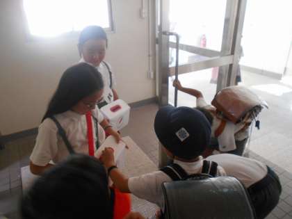生活安全委員会の児童が、募金箱を持って、協力を呼び掛けています。