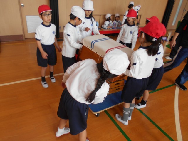 とびばこあそびのやり方を知り、いろいろなとびばこあそびをしています。今日は、平均台の上を腕の力で前に進んだり、つなげた跳び箱をつかって、またぎのり、またぎおりをしたりしました。協力して片づける姿も素敵でした。