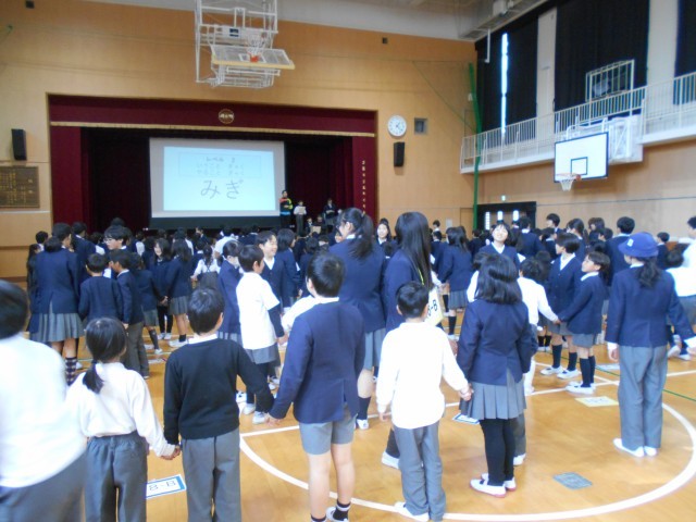1,3,6年生は体育館で「言うこといっしょ、やることいっしょゲーム」