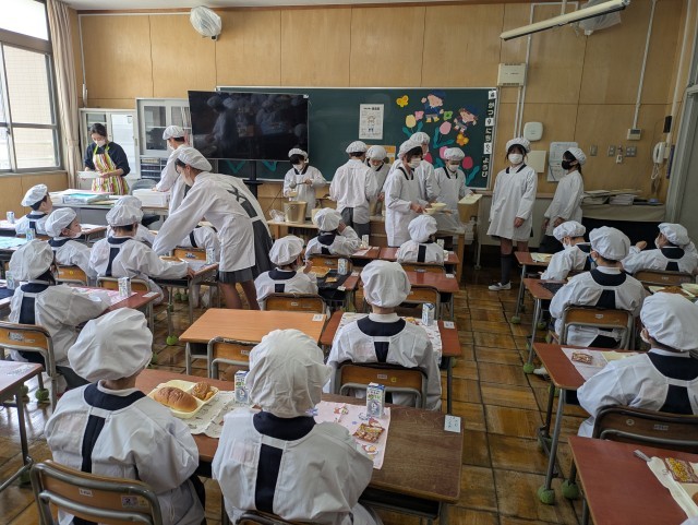 1年生の給食のお手伝いをしています。1年生が自分たちでできるようになるために、配膳の仕方を見本となって行っています。