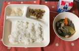 今日のこんだて【米飯、鶏肉と野菜の煮もの、じゃこ豆、かぶのゆず風味、牛乳】 「...