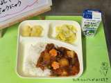 今日の献立は、ハヤシライス、キャベツのバジル風味サラダ、洋なし(カット缶)、牛...