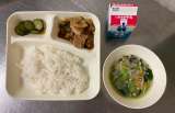 【かやくご飯、みそ汁、まっ茶ういろう、牛乳】 かやくご飯の具には、鶏肉、ちくわ...