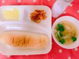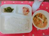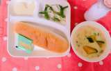 今日のこんだて【コッペパン、かぼちゃのクリームシチュー、キャベツと三度豆のサラダ...