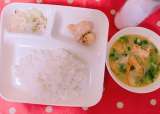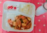 今日のこんだて【おさつパン、えびのチリソース、中華スープ、りんご(缶)】 「えび...
