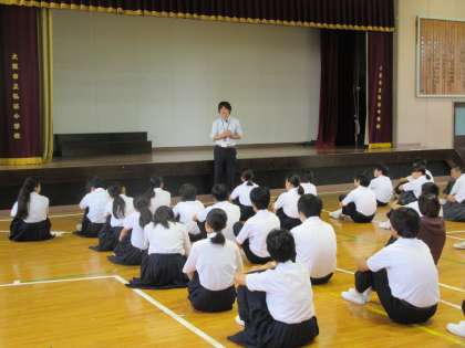 6月12日(水)の生徒朝会では、校歌斉唱の後、各委員会の委員長より月目標の発表がありました。