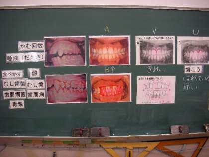 高学年の歯みがき指導では、野生のニホンザルと動物園のニホンザルの口腔写真を見せていただきました。